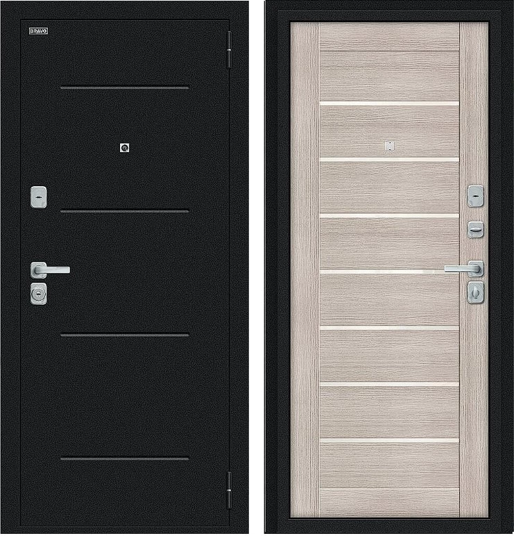 Надежная входная Дверь Браво Техно/BChrome Букле черное/Cappuccino Melinga премиум класса по цене 34 530 руб. Большая толщина стали защитит от проникновения в ваш дом, квартиру или коттедж. Используется очень качественная фурнитура: замки, цилиндры, ручки, защелки. Покрытие и отделка двери изготовлено под внимательным контролем производителя. Дверь имеет долгий срок службы и гарантию.