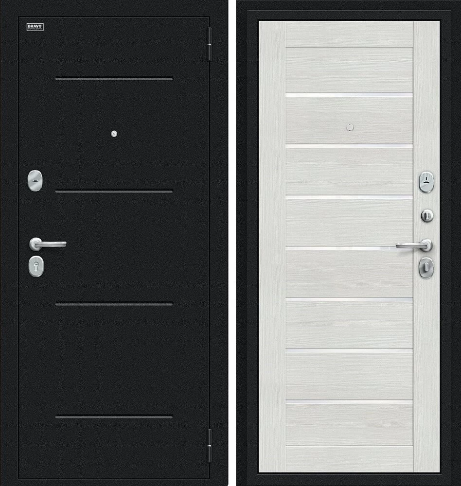Надежная входная Дверь Браво Техно Букле черное/Bianco Veralinga премиум класса по цене 32 780 руб. Большая толщина стали защитит от проникновения в ваш дом, квартиру или коттедж. Используется очень качественная фурнитура: замки, цилиндры, ручки, защелки. Покрытие и отделка двери изготовлено под внимательным контролем производителя. Дверь имеет долгий срок службы и гарантию.